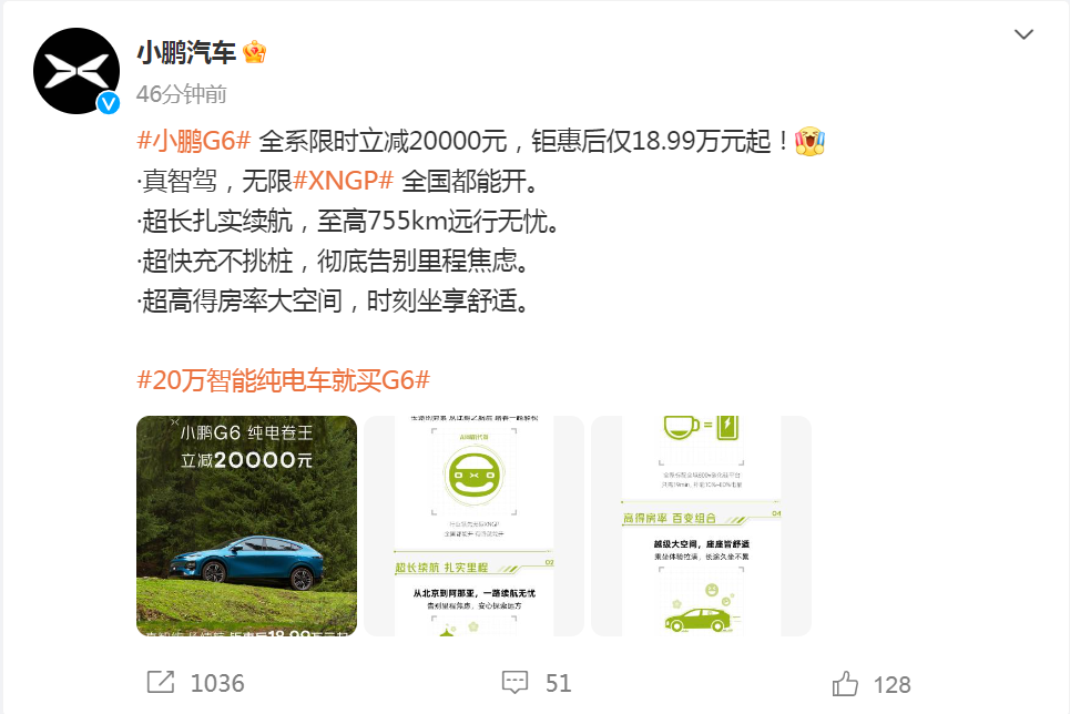 同时,小鹏汽车宣布,2024年3月31日前,小鹏G6全系车型限时立减20000元,优惠后售价为18.99万元起。