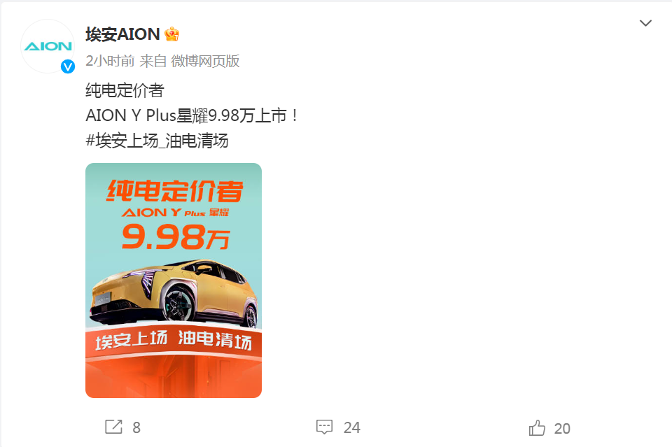 3月3日,广汽埃安官博宣布,AION Y Plus星耀版车型正式上市,售价9.98万元。