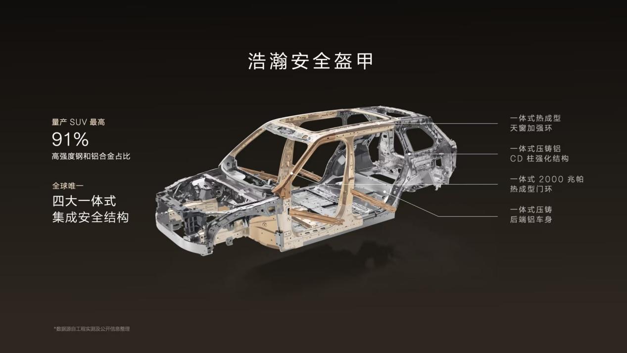 浩瀚安全盔甲:车身扭转刚度达41600N·m/°,采用四大一体式集成结构与2000MPa热成型钢,成功完成行业首次105km/h四面连环碰撞测试,树立混动安全新标杆。