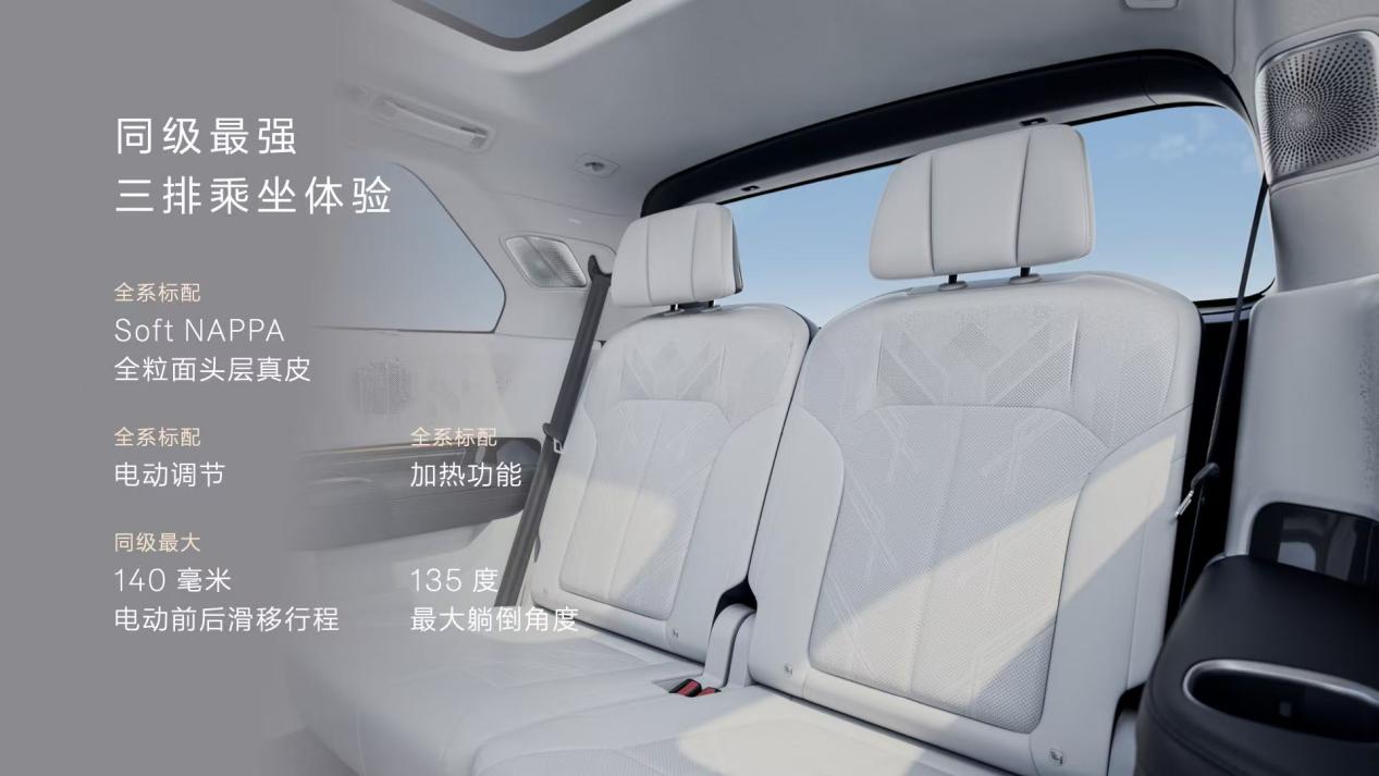 毫无妥协的第三排:第三排拥有135度躺角、140mm电动滑移行程、专属独立天幕,以及“坐坐高升”的布局带来的开阔视野,彻底告别了传统SUV第三排的压抑与局促。