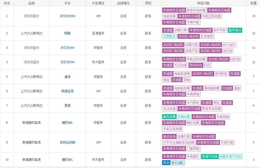 除此之外,在第三方汽车投诉平台中,关于沃尔沃的投诉也并不少见,有趣的是,尽管欧系品牌(不包括德系、法系)在国内的保有量少之又少,但沃尔沃还是凭借沃尔沃XC60、沃尔沃S60等车型在欧系车投诉中问鼎,而其中问题更是五花八门,影音故障、发动机动力消失、变速箱无法加速/故障等等紧紧缠绕着保有量、销量并不高的沃尔沃。